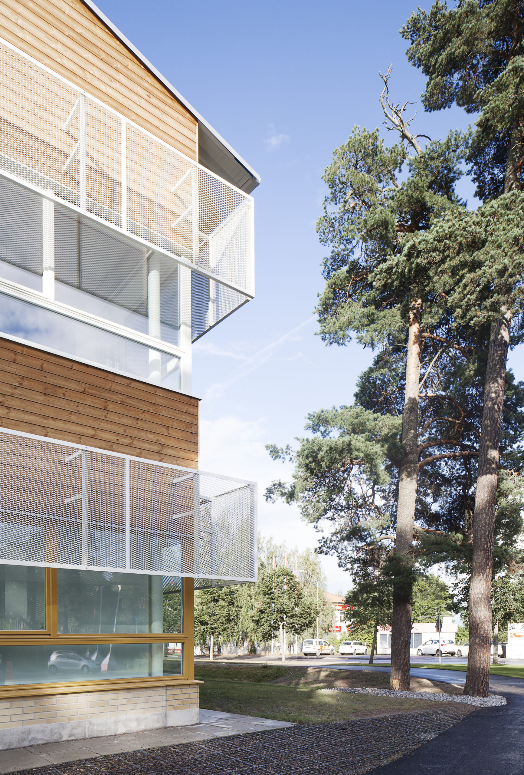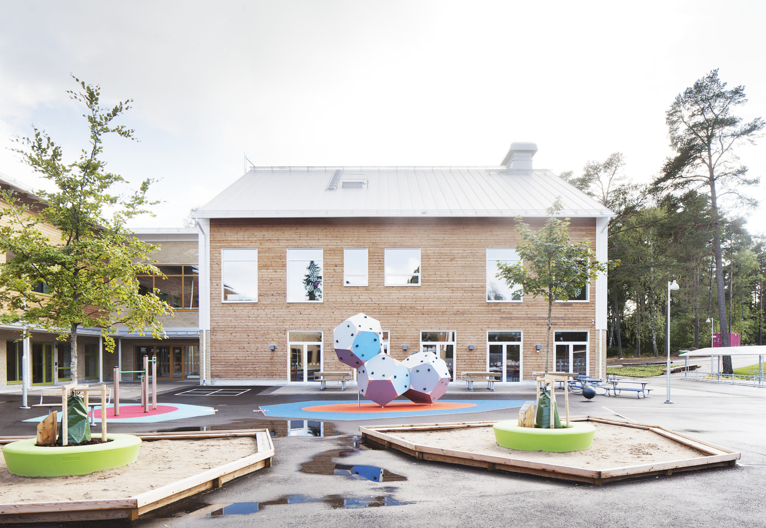 Skolan är formmässigt uppdelad i olika volymer vilka avspeglar de olika verksamheterna. Fasadbeklädnaden varierar och hittar inspiration för material och kulör i bl.a. de omgivande talldungarna.