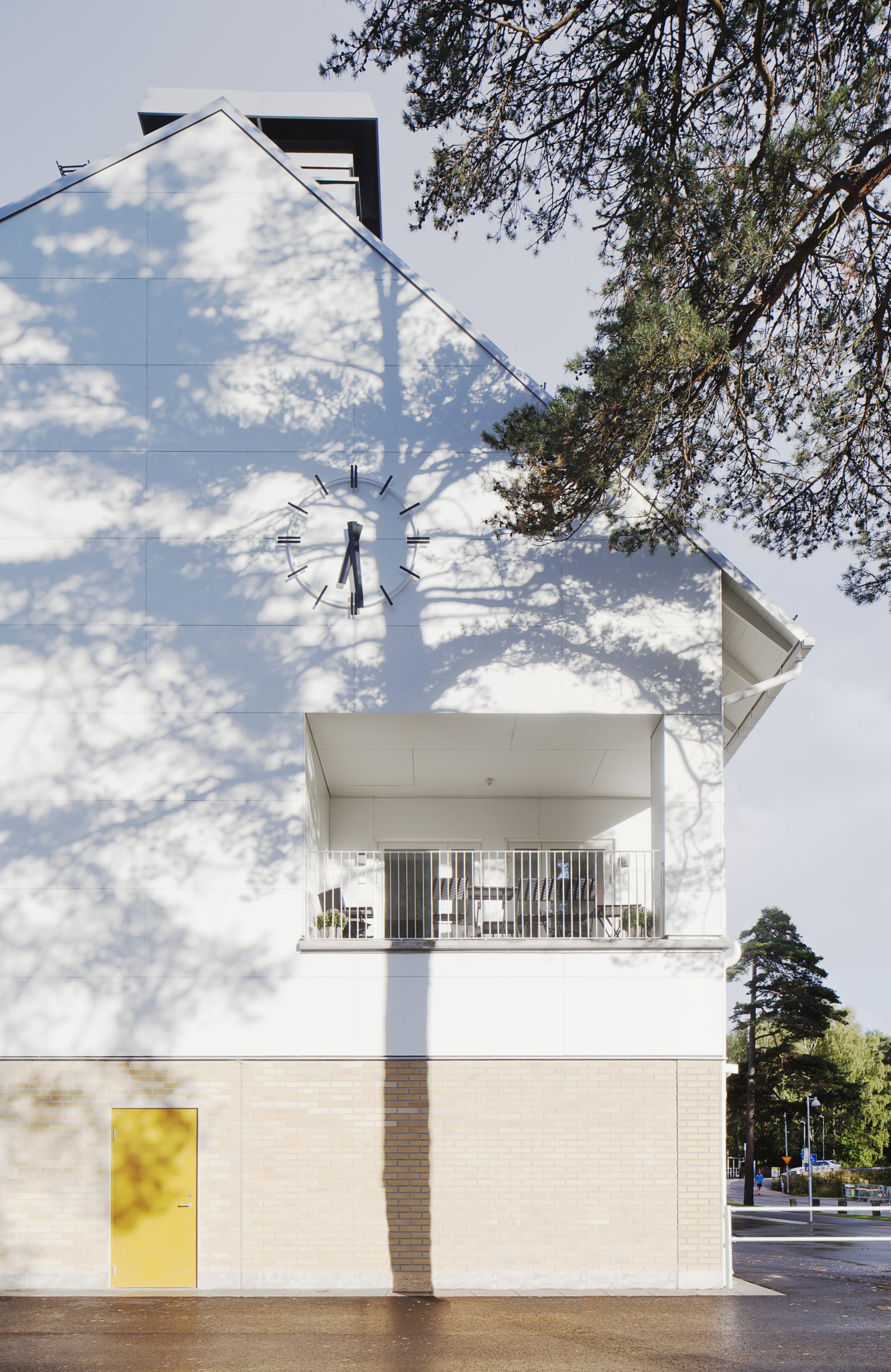 Fasadbeklädnaden varierar och hittar inspiration för material och kulör i bl.a. de omgivande talldungarna.