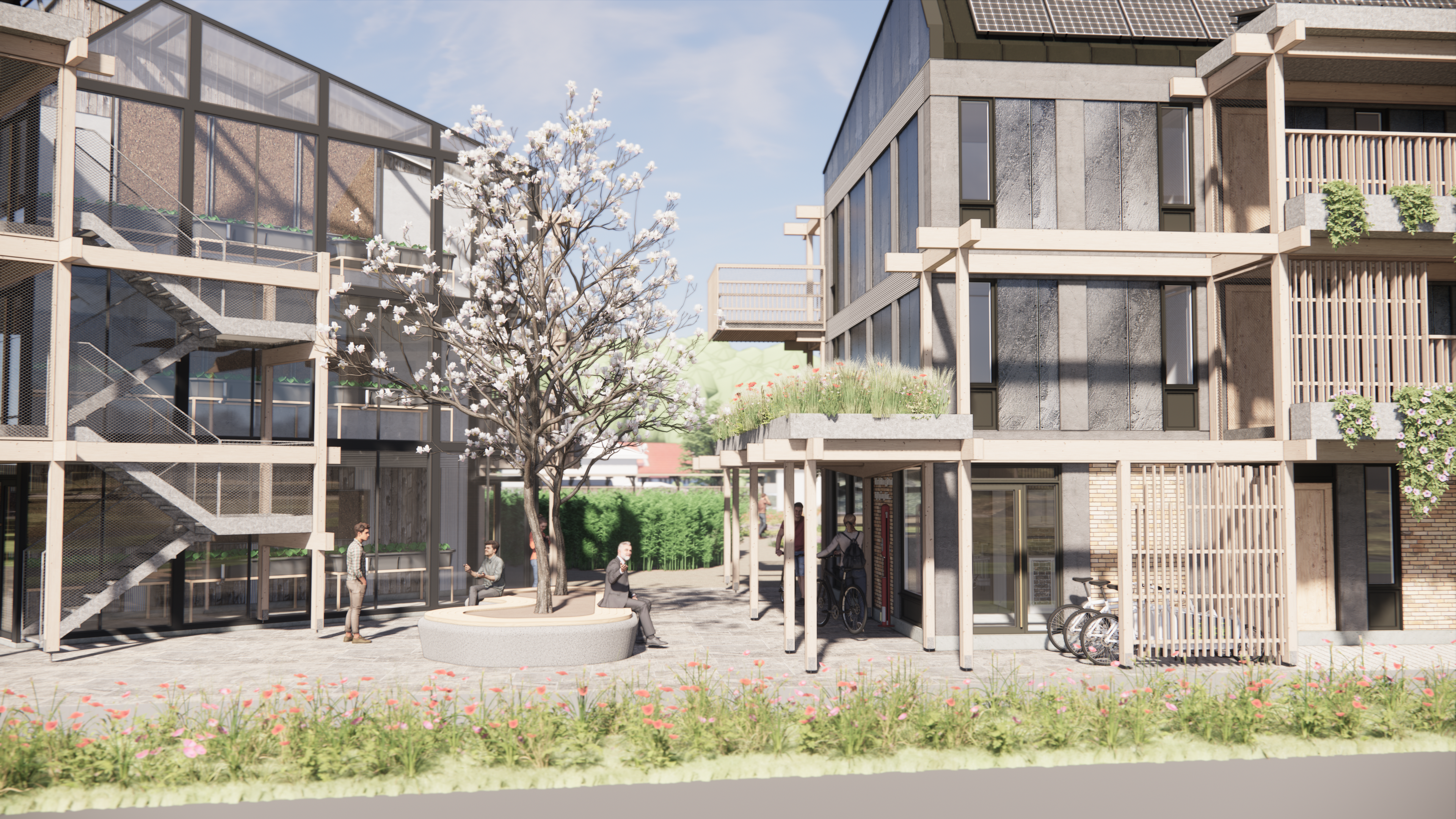 En av de viktigaste aspekterna i både den inre och yttre miljön är flexibilitet. Flexibiliteten återspeglar sig i byggnadernas modulsystem, möjligheten att anpassa fasadmaterial samt föränderligheten i planlösningarna. Utemiljön genomsyras av ytor som kan användas på flera olika sätt och även andra element görs konverterbara för att kunna anpassas till tidens konvenans.