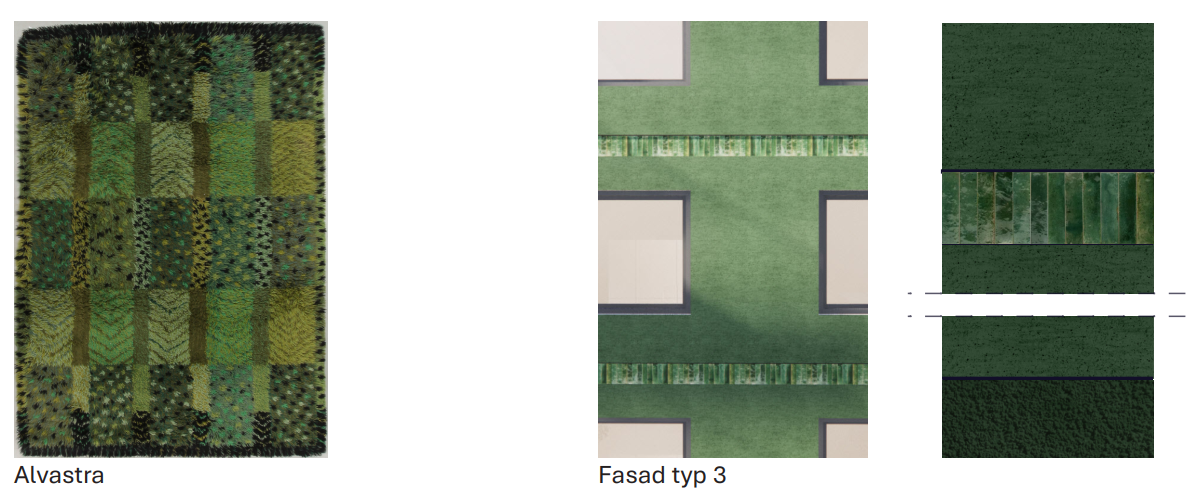 För att greppa an till historien om platsens förvandling från Industriområde där Wahlbecks mattorna tillverkades, till området med nyproduktion av bostäder har vi i vårt förslag tagit utgångspunkt och inspiration från Marianne Richters mattserie Östergyllen.