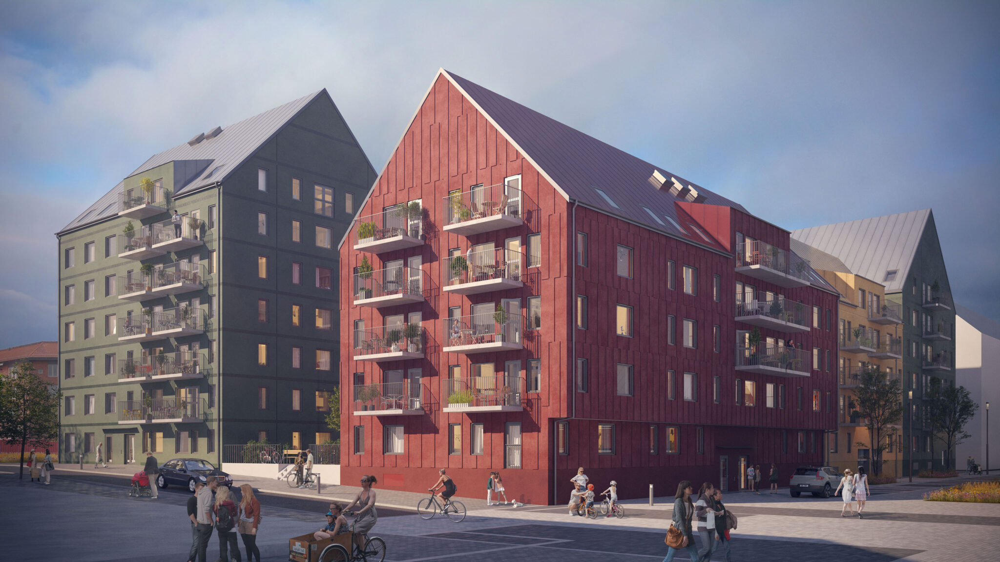 sveper runt alla kvarterets volymer och skapar ett gemensamt element som sammanhåller kvarterets olika utformningar.