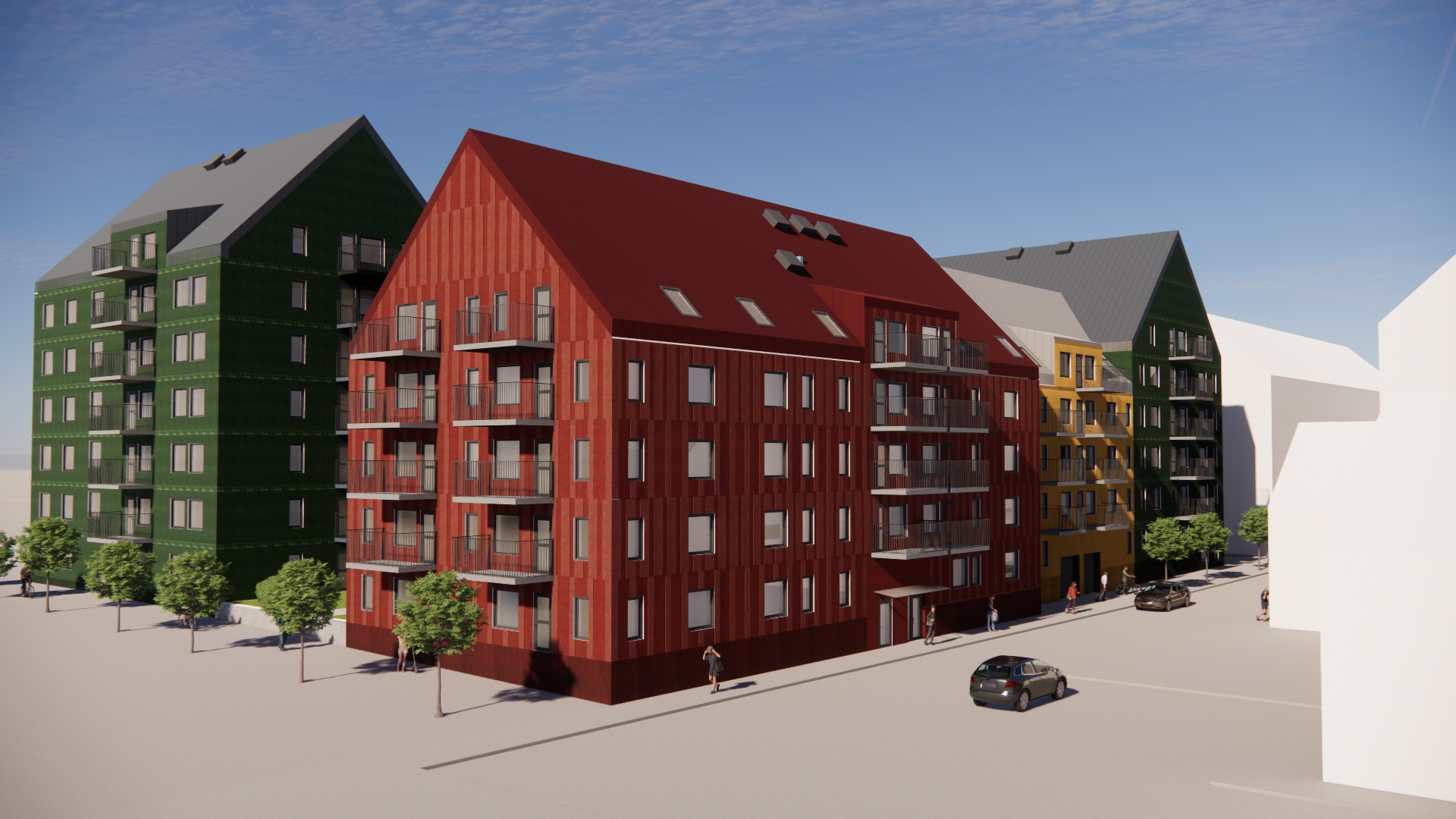 Två fönstertyper är genomgående för projektet och skapar en varierad rytm i fasaden som samspelar med takkupor, takfönster och utformning av balkonger. fönsterkarmar, entrédörrar samt balkongräcken kontrasterar fasadens kulörer i en standardkulör och ger ett harmoniskt intryck.