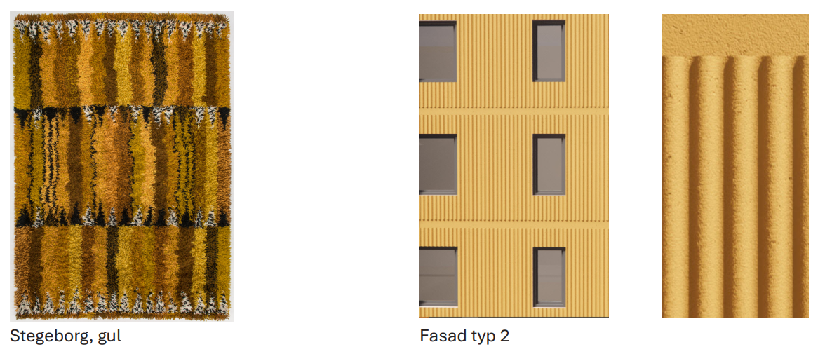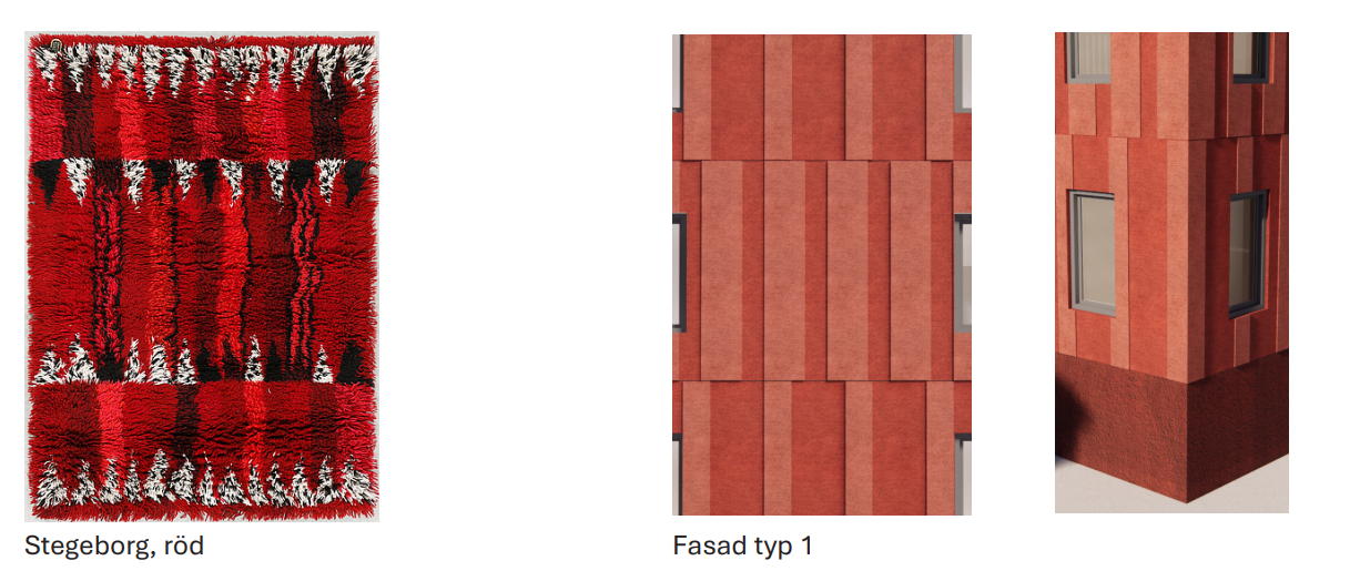 För att greppa an till historien om platsens förvandling från Industriområde där Wahlbecks mattorna tillverkades, till området med nyproduktion av bostäder har vi i vårt förslag tagit utgångspunkt och inspiration från Marianne Richters mattserie Östergyllen. Den populära mattserien Östergyllen designades av den välkända textilkonstnären Marianne Richter och tillverkades i Wahlbecks fabriker i Linköping. Mattornas mönster och kulörer har varit utgångspunkten i utformningen av kvarterets olika fasaduttryck. Mattmönstrets horisontella repetition upprepas i fasadernas relieffer i olika uttrycksätt där mattornas tre olika kulörer och mönster ligger som underlag för utformningen av bostadsområdet och sätter en ton inspirerad av platsens historia.