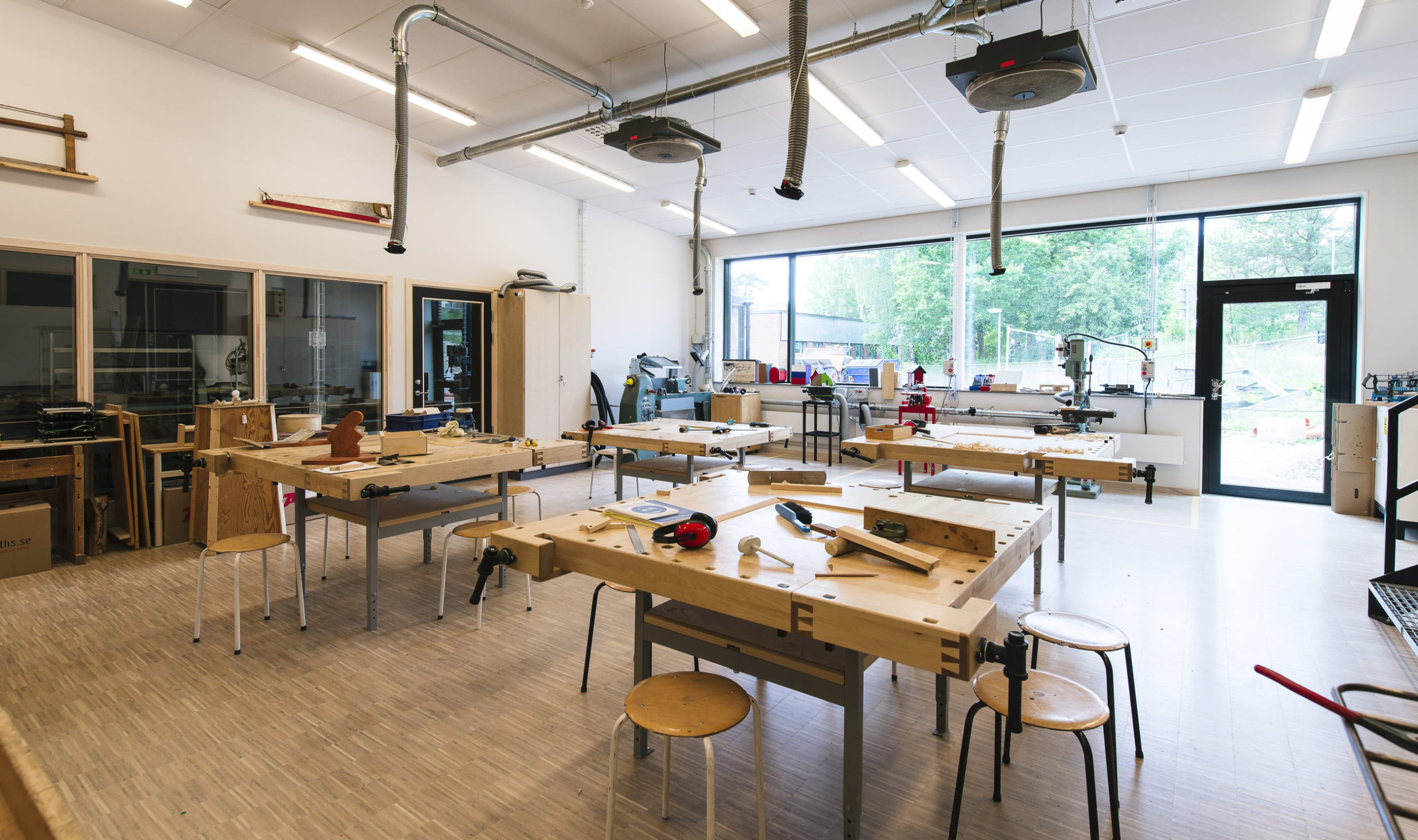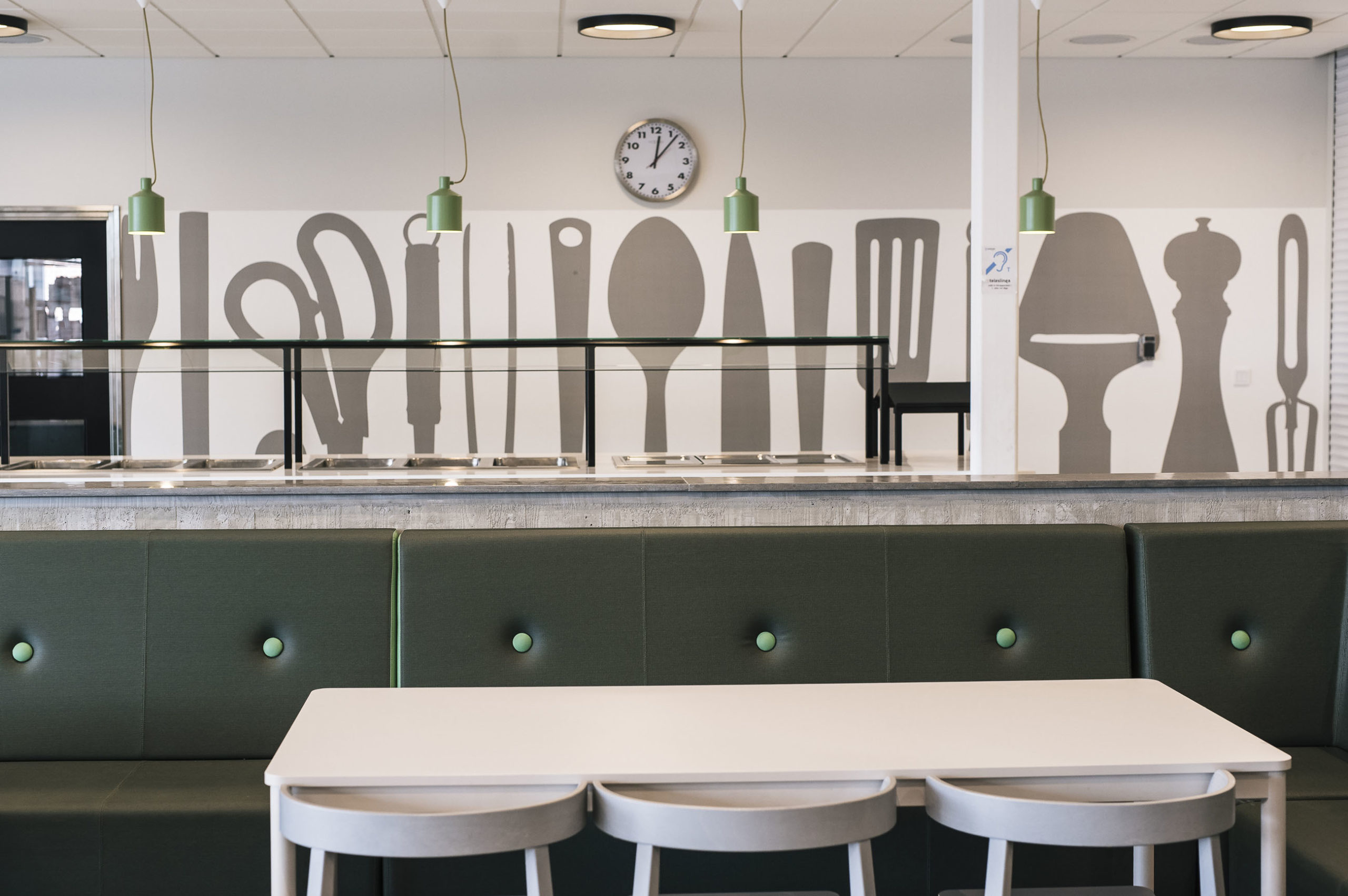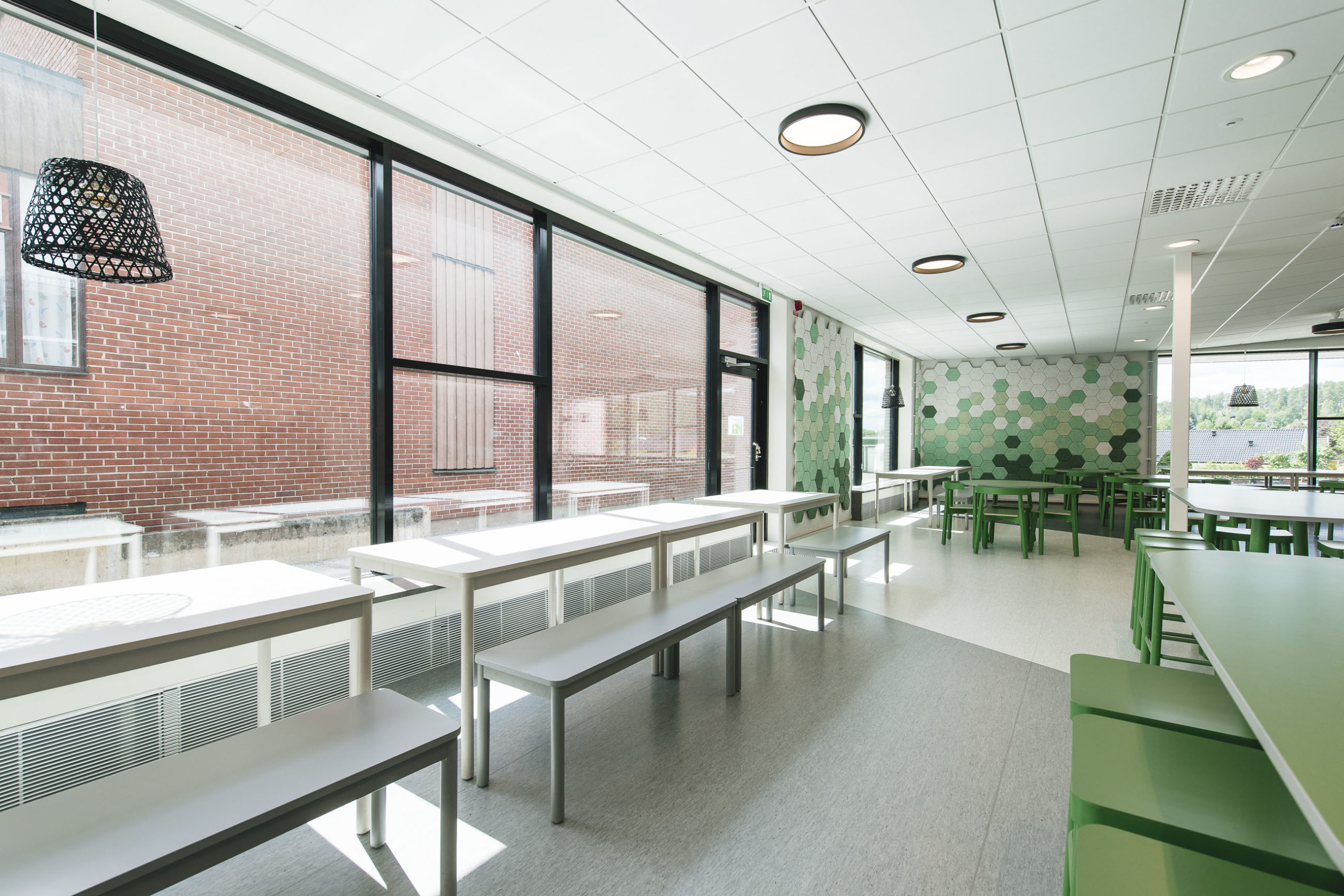 Vita bord och gröna stolar i klassrum