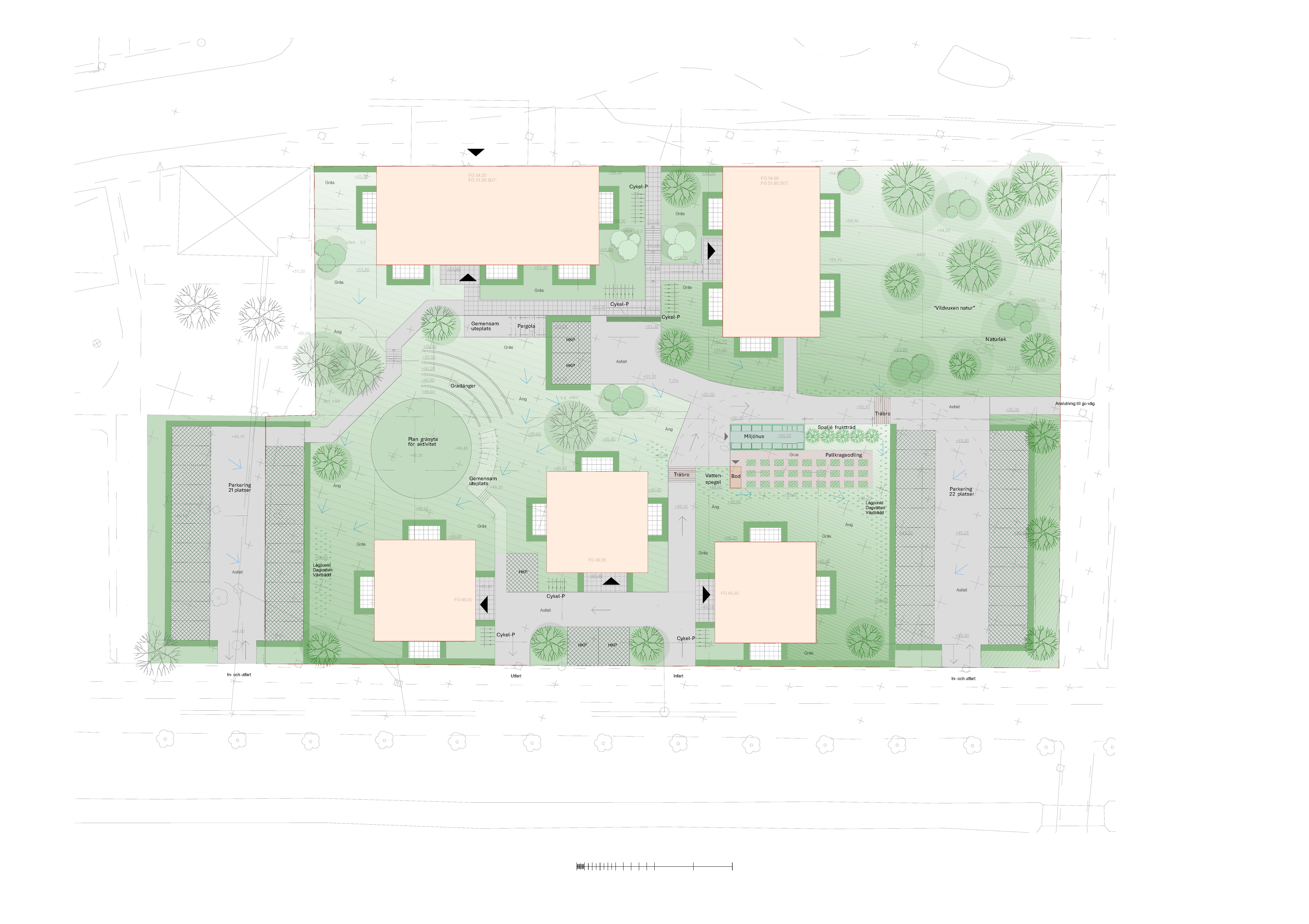 Det mittersta gårdshuset har skjutits in en aning från tomtgräns för att skapa en egen liten förgård för gårdshusen, samt skapa variation och dynamik på innergården likväl som på promenadstråket längs med ån. Gårdshusen får en egen liten förgårdsmark med utsikt över ån och ängar.