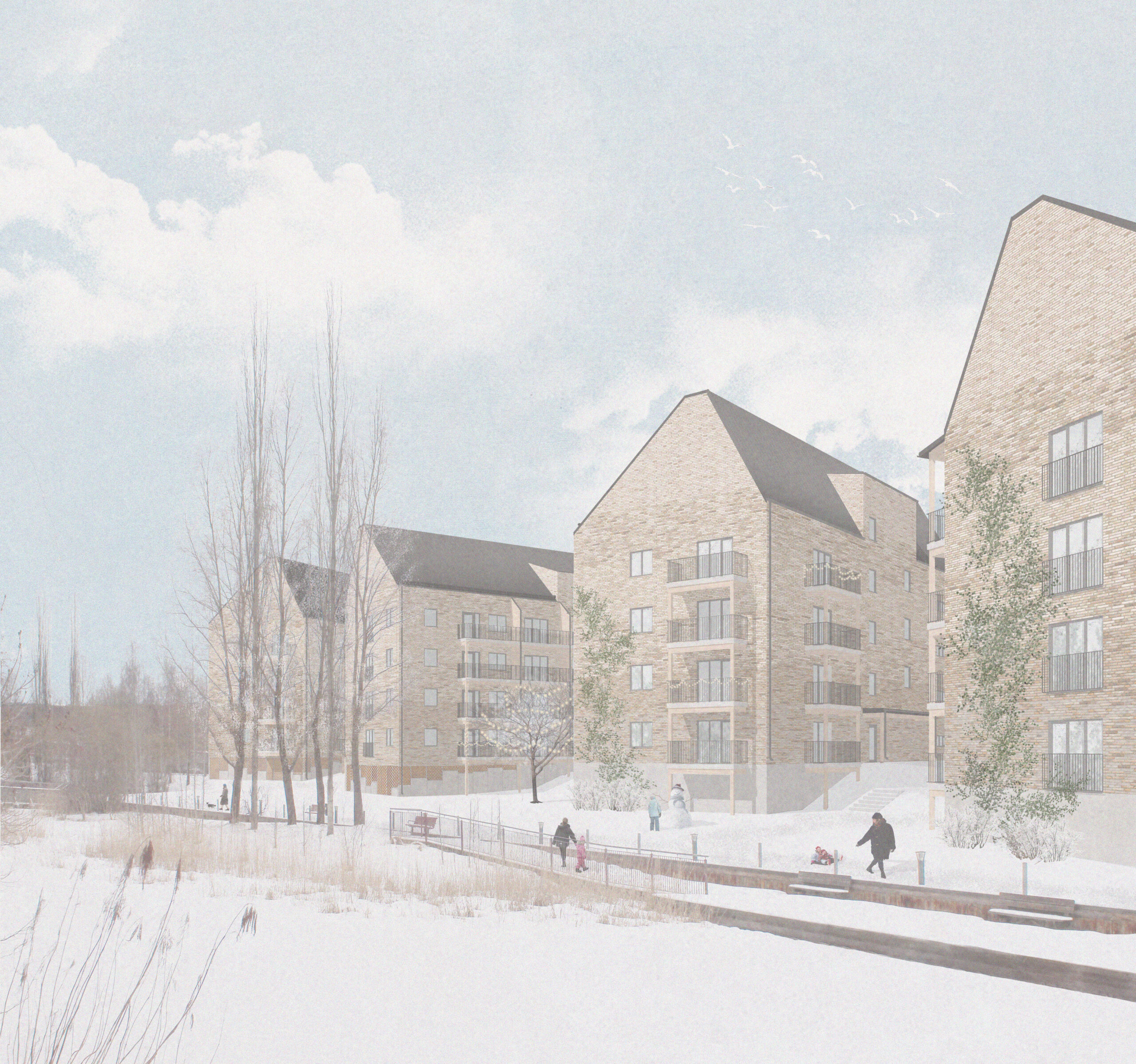 Husens avslut nära gångvägen intill vattnet bidrar till att skapa en rumslighet runt dammen. Eftersom gavelfasaderna sammanfaller med gångstråket indikerar dom en naturlig gräns för var det semioffentliga stadsrummet tar vid.