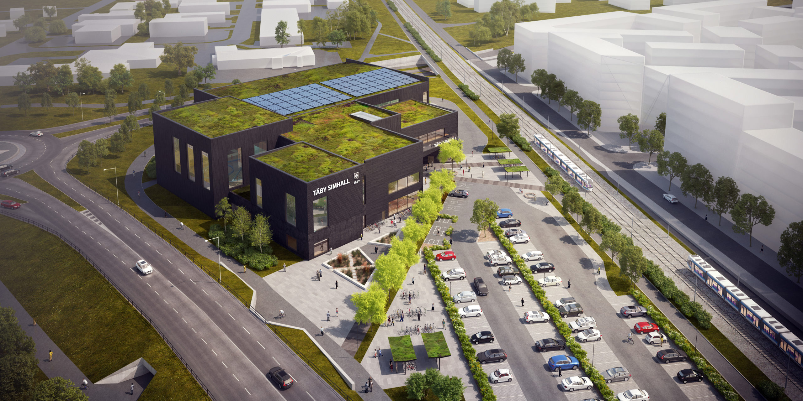 Vårt uppdrag har varit att rita en ny simhall på en annan plats i utkanten av Täbys centrumområde. Samtidigt medför det utmaningar så som att passa in det stora programmet på en utrymmesmässigt begränsad plats och förhålla byggnaden till de säkerhetsavstånd som infrastrukturen medför.
