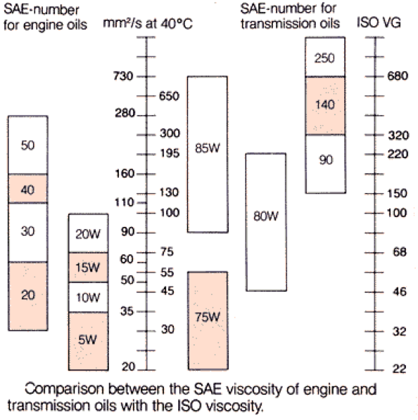 The figure below gives a good survey of the difference between the viscosity classes of SAE and ISO. Drawing a horizontal line from one class to the other makes it obvious that most of the SAE classes cover a much larger viscosity range than the corresponding ISO classes.