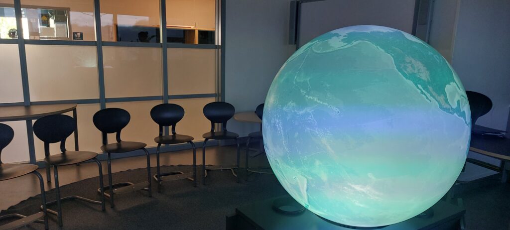 Den digitala globen placeras mitt i klassrummet och fångar direkt elevernas uppmärksamhet. Resan börjar med en kort genomflygning av jordens historia och leder sedan in på temat kartor och visualiseringar av världen. Här får eleverna upptäcka hur kartor representerar världen, vad färgerna på kartor betyder samt hur jorden har avbildats genom historien.