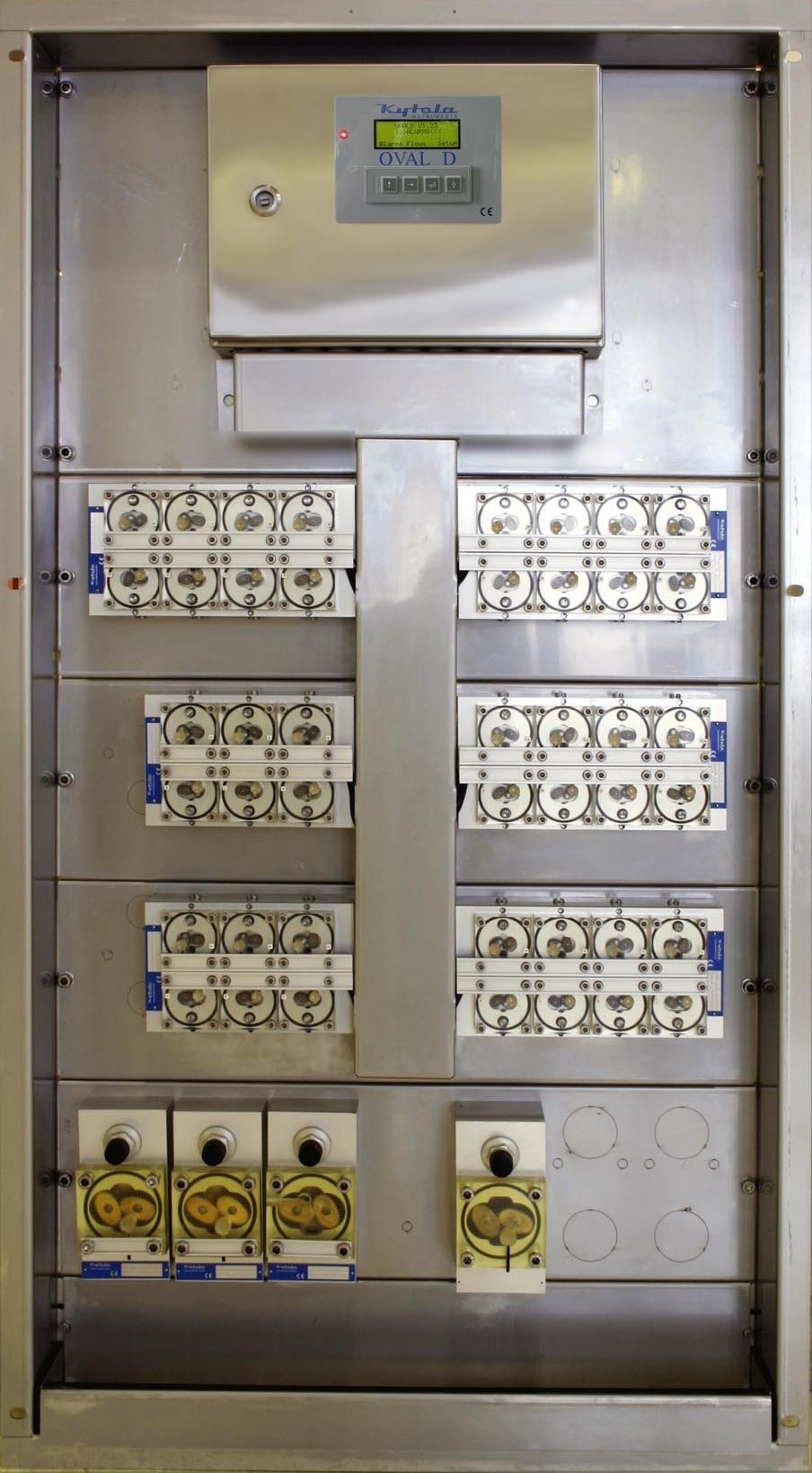 The meters are assembled to form metering panels. The meters are connected to an electronic metering station which can monitor 48 meters.