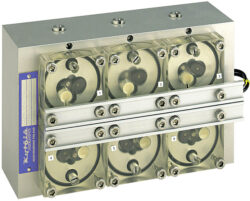 The flow meters are available as individual units SR-10, SR-20, SR-30, SR-60, and SR-100 (see table below), but also in blocks with a multiple of meters. They are available with 4, 6, or 8 metering units (SR4-X, SR6-X, and SR8-X). The inlet connection is common to all units.