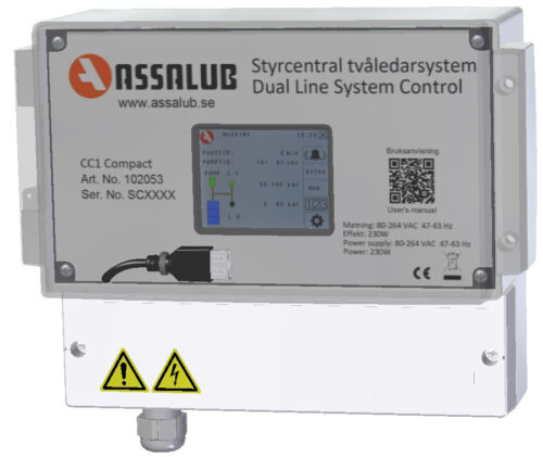 CC1 Compact is a slimmed version of CC1 Mk II with the same functions but with a smaller touch display. It’s a control unit for controlling a dual-line system. It alarms when something goes wrong, like when pressure isn’t reached in time, the lubricant reservoir is running low, there’s too high resting pressure, or when there’s a problem with the pressure transducer. If there’s an USB memory installed it will store a complete register of all the lubrications and all the alarms.