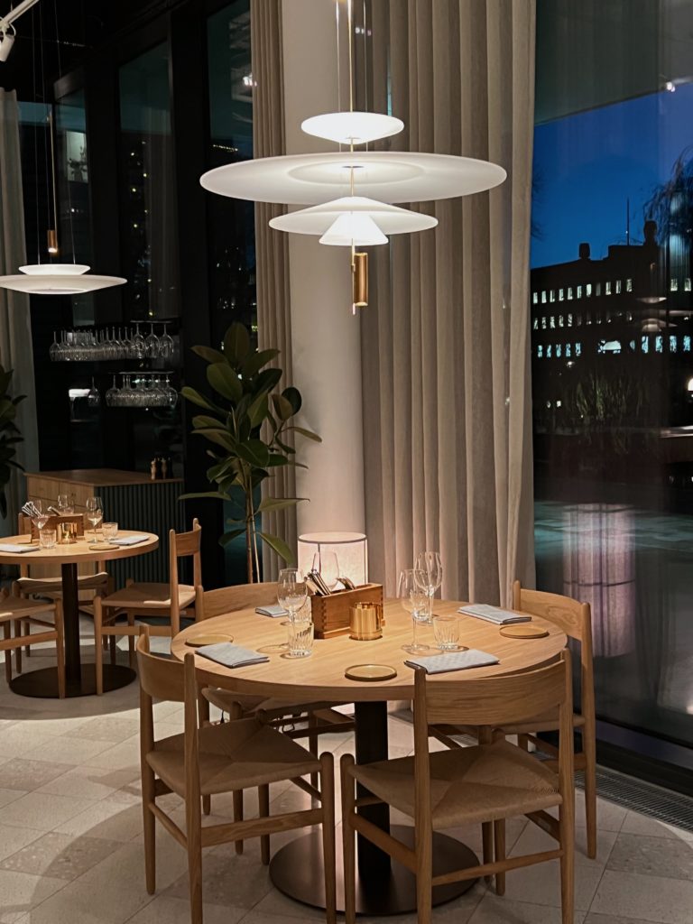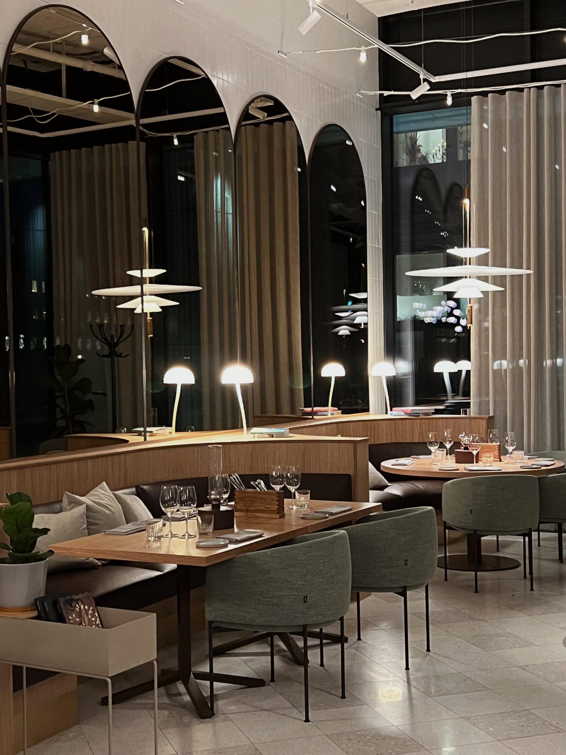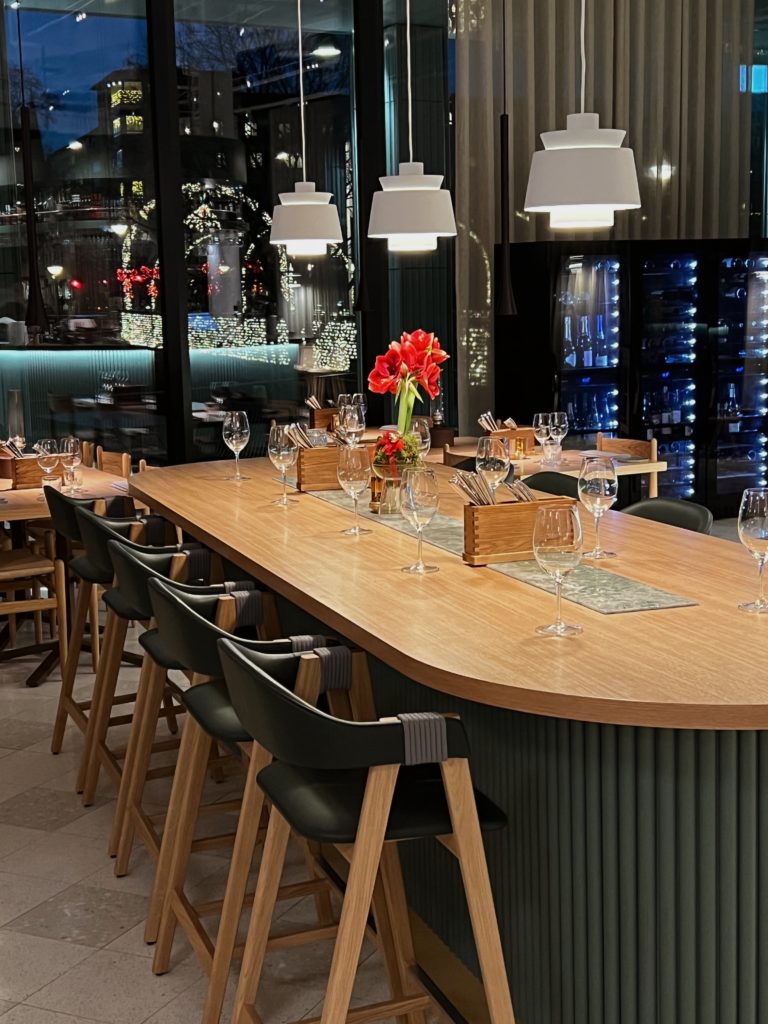 Kolmårdsmarmor, ek och ett golv med terrazzo samt högt i tak och stora partier i glas med utsikt mot Stångån var utgångspunkten att bygga vidare på. Känslan från husets speciella exteriör letar sig vidare till restaurangen via entréhallen, huset är ritat av Gert Wingårdh och slog upp portarna 2021.