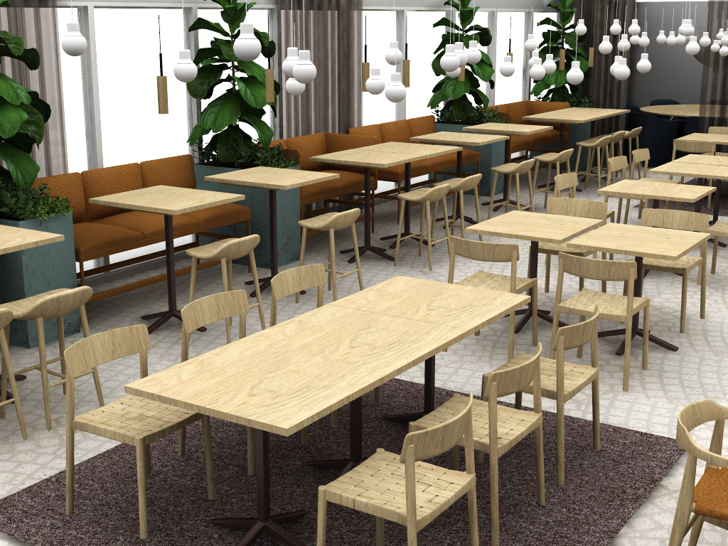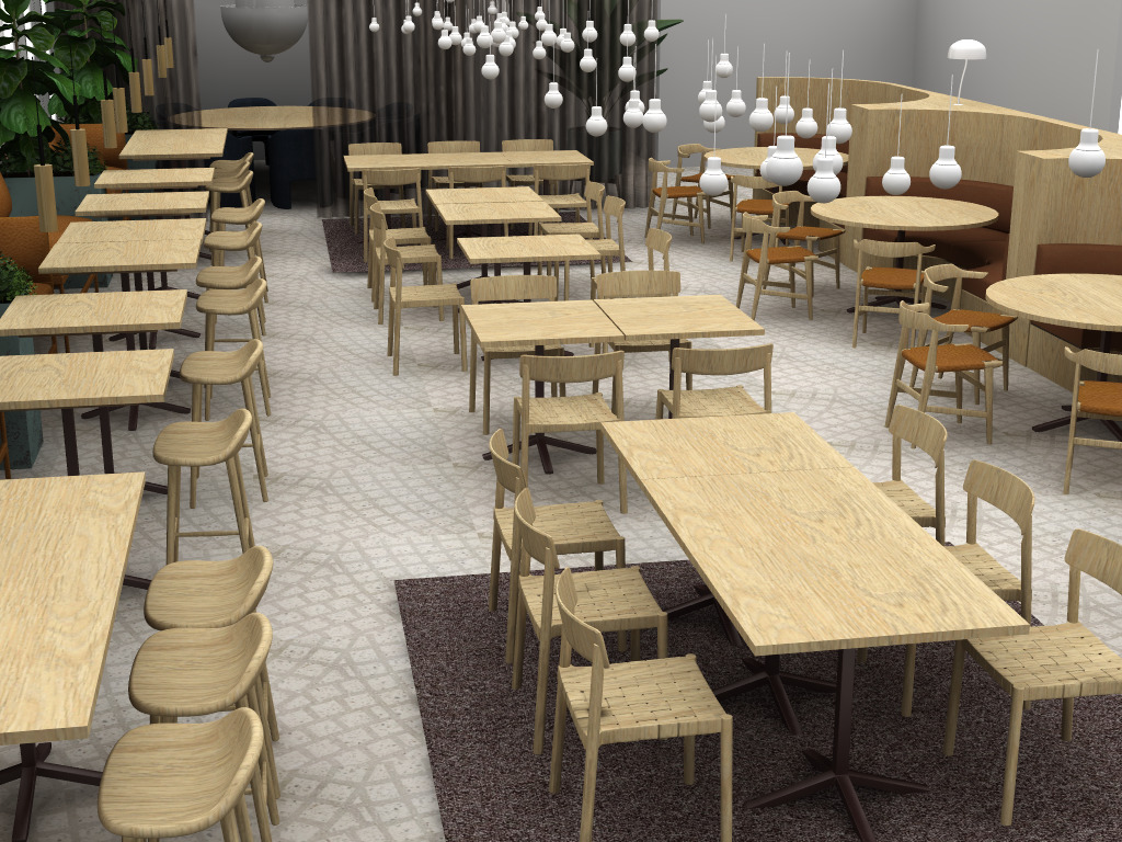 Alla möbler och material är valda för att tåla en restaurangs dagliga bruk och ska enkelt kunna flyttas om för att skapa nya konstellationer som fortfarande ska kännas trevliga och genomtänkta.